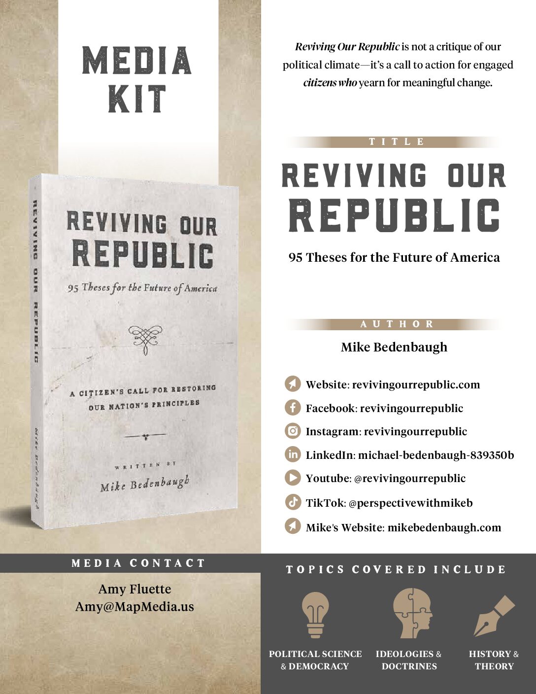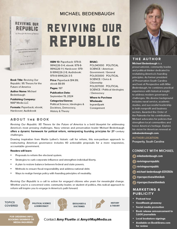 The Reviving Our Republic media kit is designed for retailers, libraries, and media agencies, offering key information about the book and its mission to inspire civic engagement and a return to foundational American values.